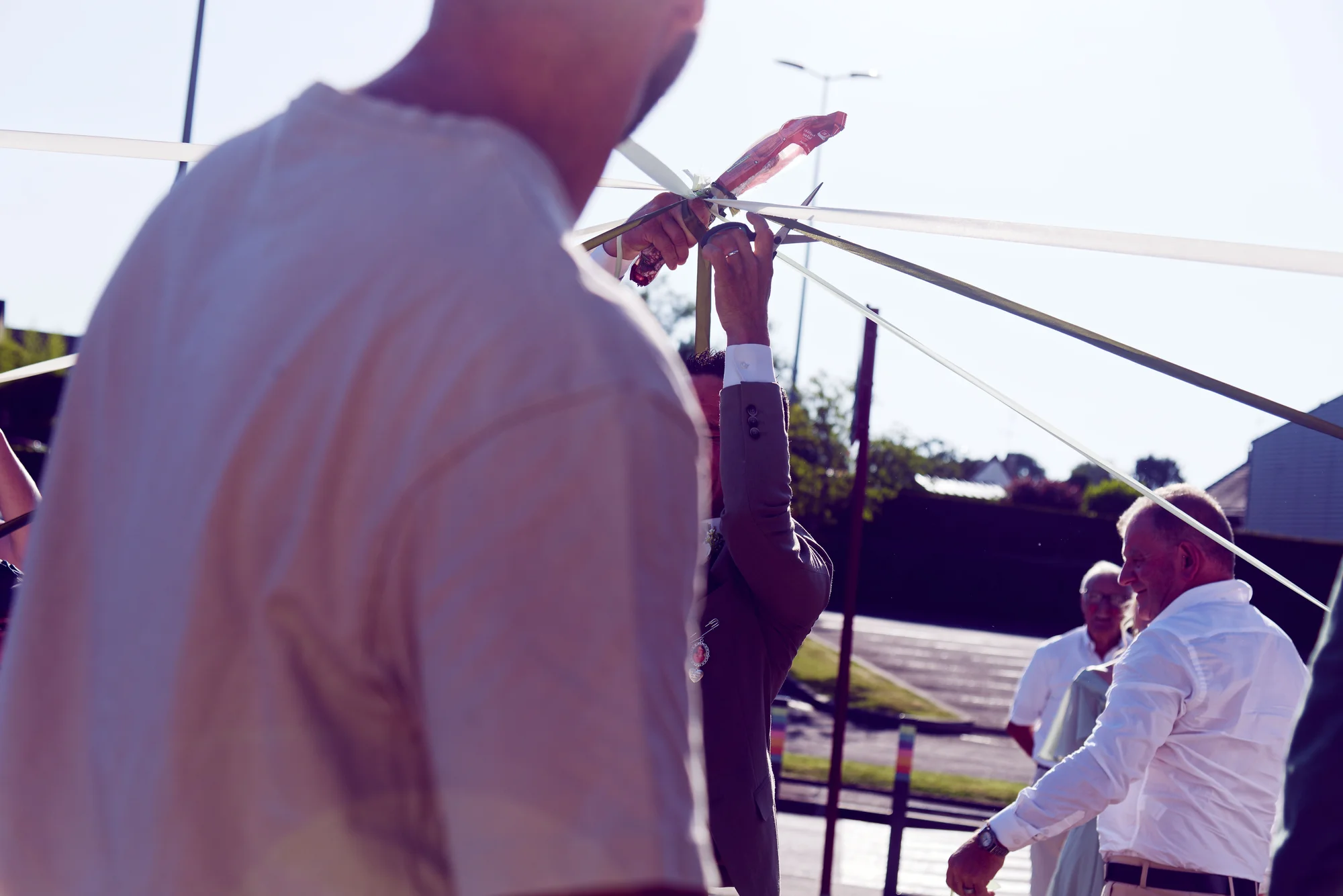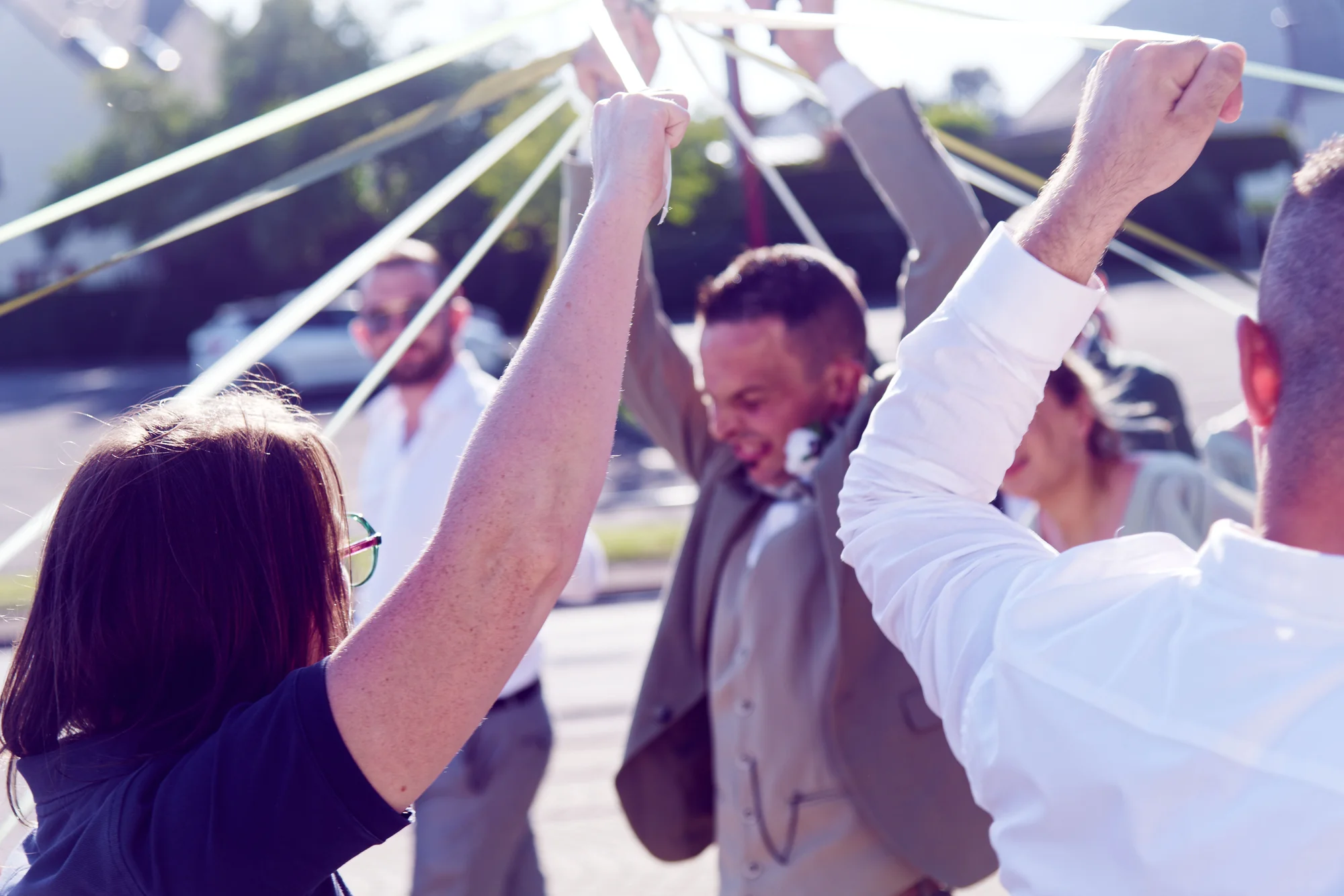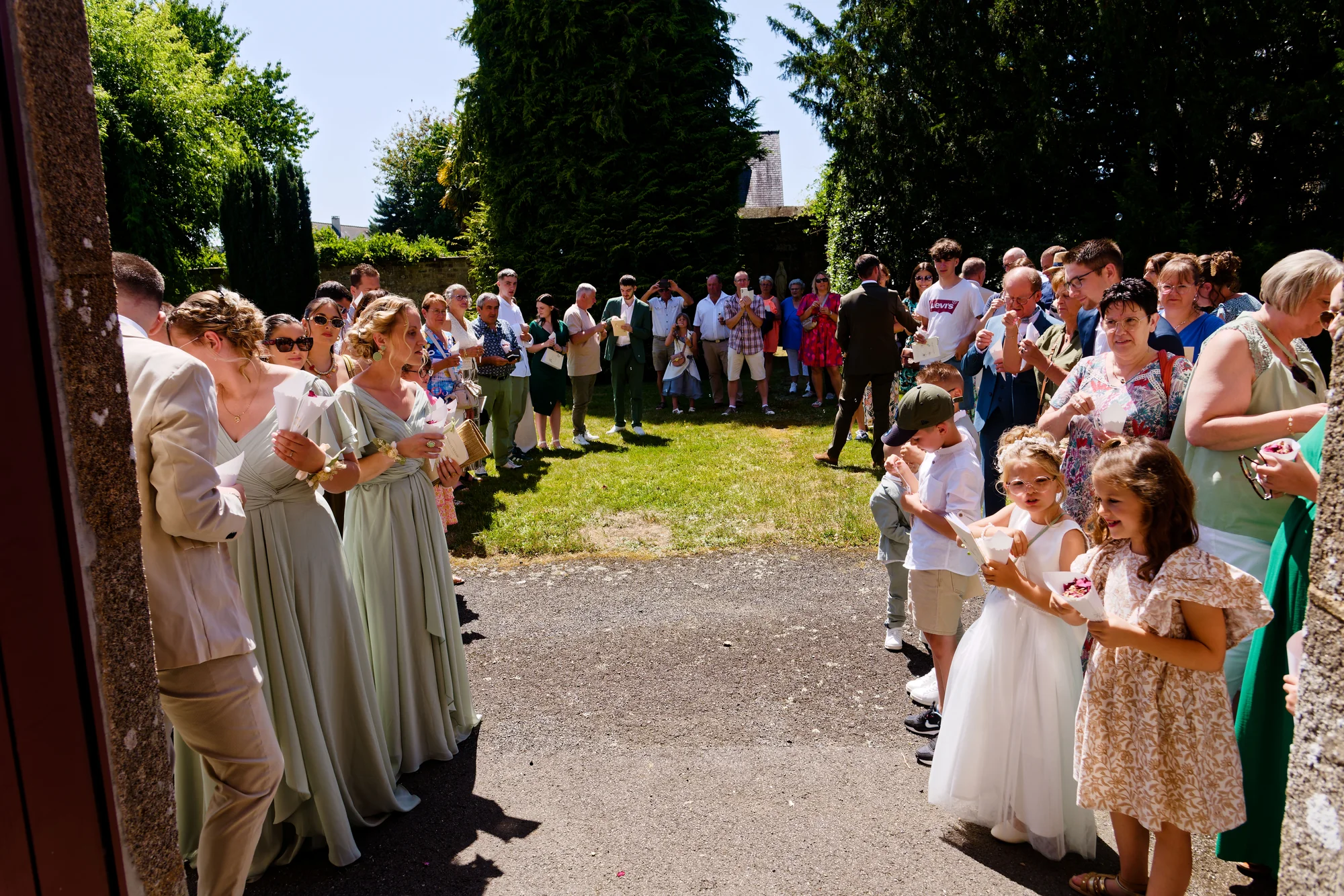 La sortie de cérémonie laisse place à une liesse communicative. Le jeu des rubans, véritable ballet de couleurs et de rires, réunit les invités autour des mariés dans une dynamique de partage. Le cortège, paré de touches vert sauge, s'installe ensuite autour de tables ornées de chandelles et de fleurs des champs. Les accessoires personnalisés, comme les lunettes en forme de cœur marquées de la date du 12 septembre, ajoutent une note ludique et mémorable à ce décor bucolique.