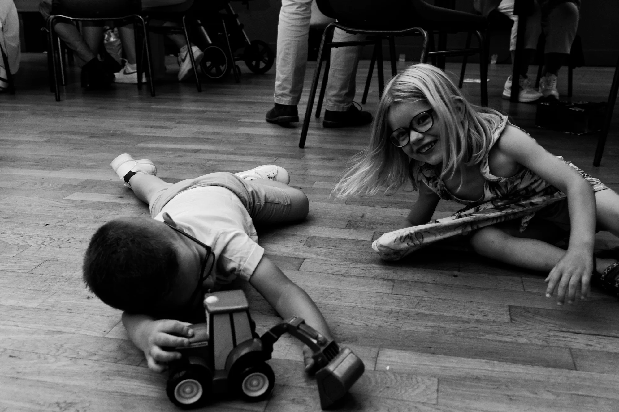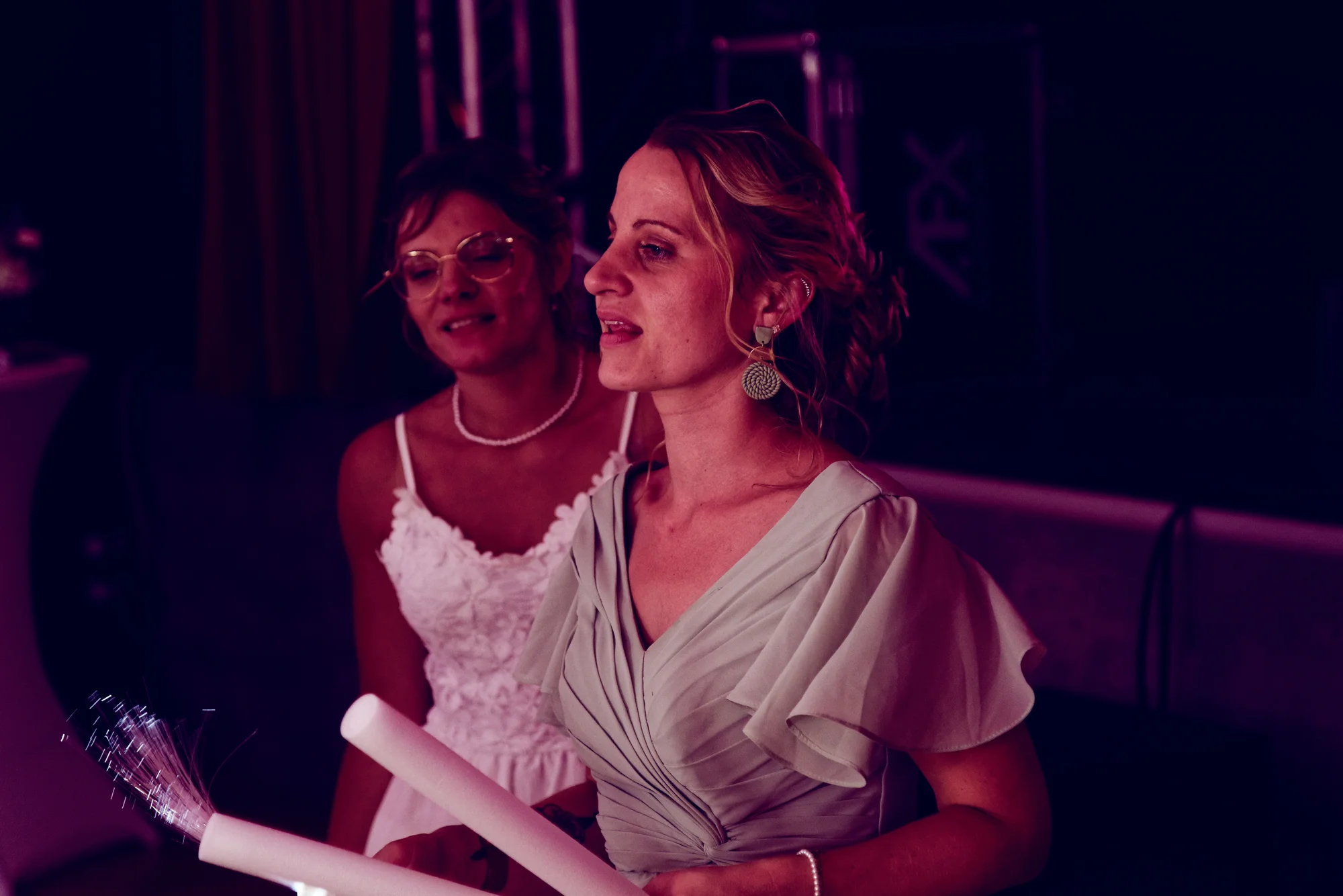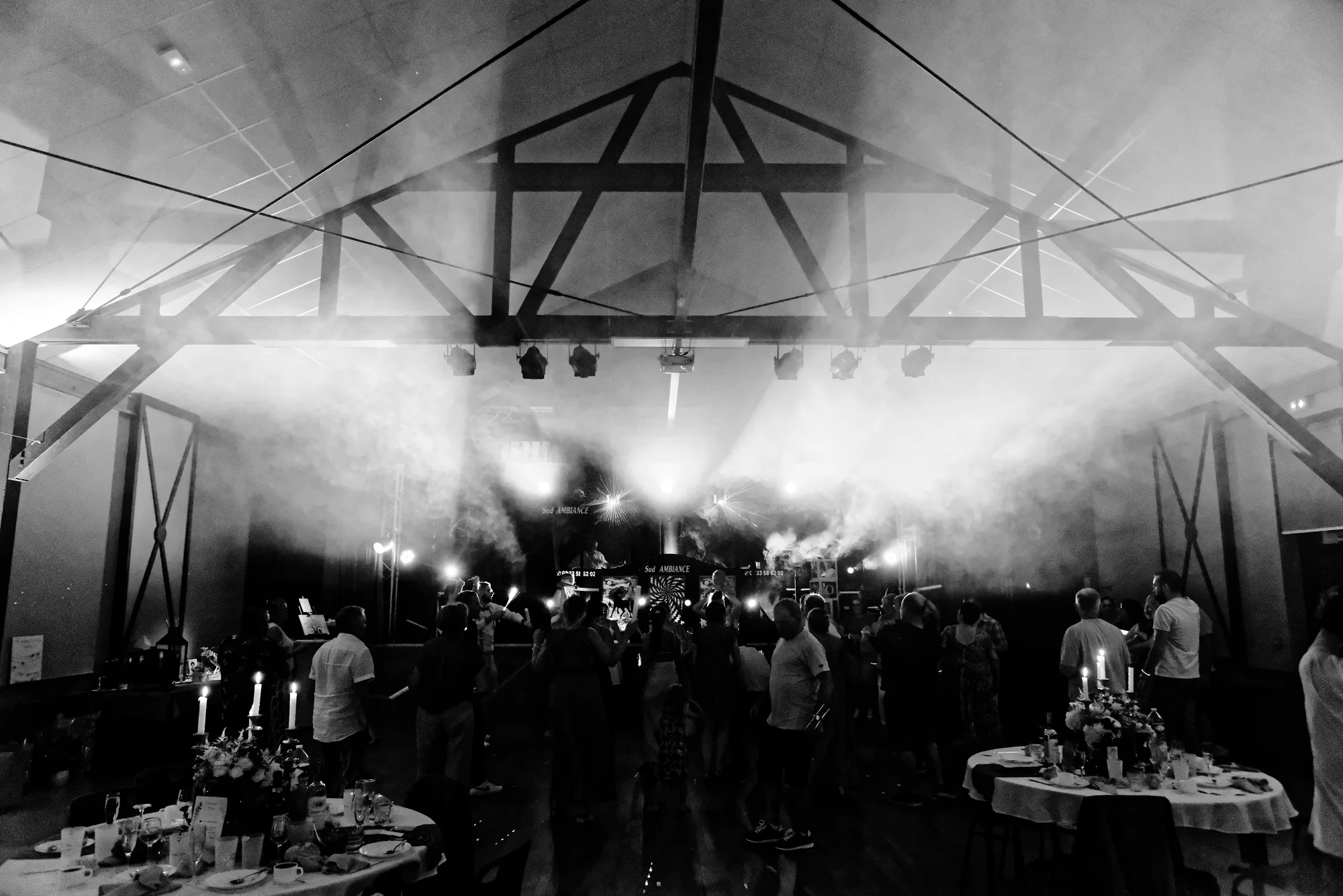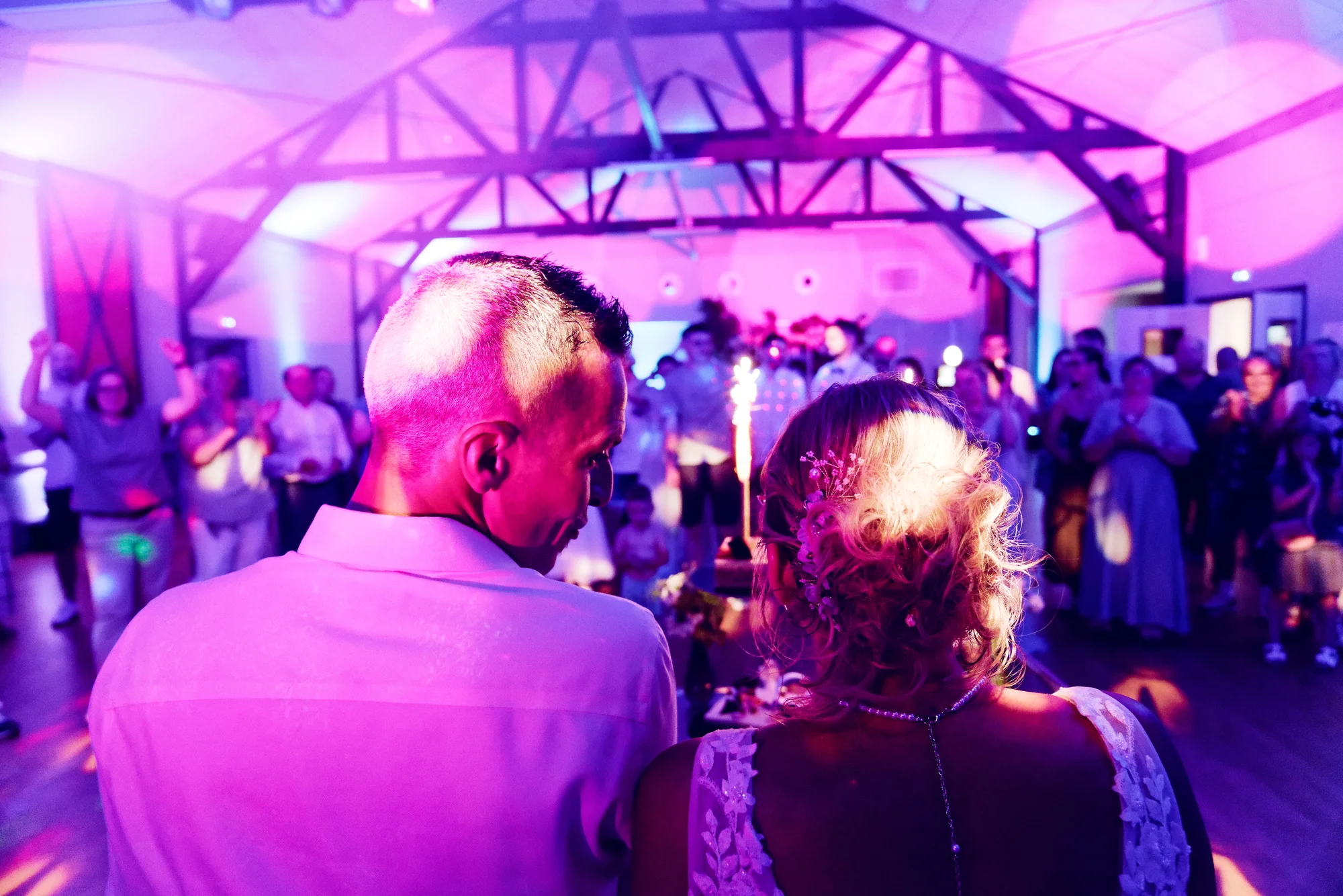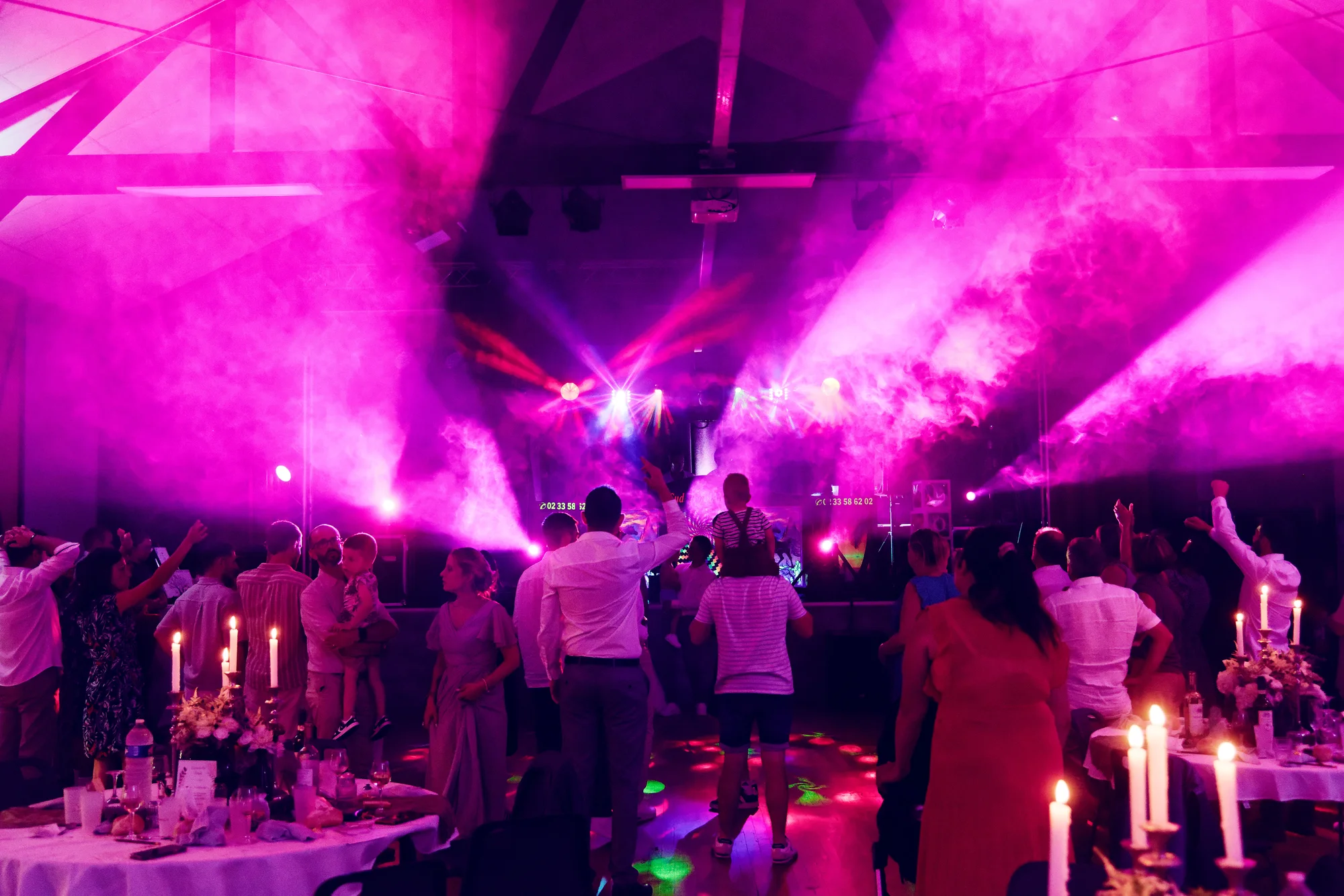 Alors que le soleil décline, l'énergie monte d'un cran. La salle de Parigny se transforme en un théâtre de fête où toutes les générations se mêlent. Tandis que les enfants s'approprient le parquet avec une insouciance délicieuse, les aînés s'émeuvent devant l'arbre à vœux. Le point d'orgue de la soirée, l'arrivée de la pièce montée sous une pluie d'étincelles, marque le début d'une nuit de danse effrénée, baignée dans des lumières vibrantes et une brume onirique.