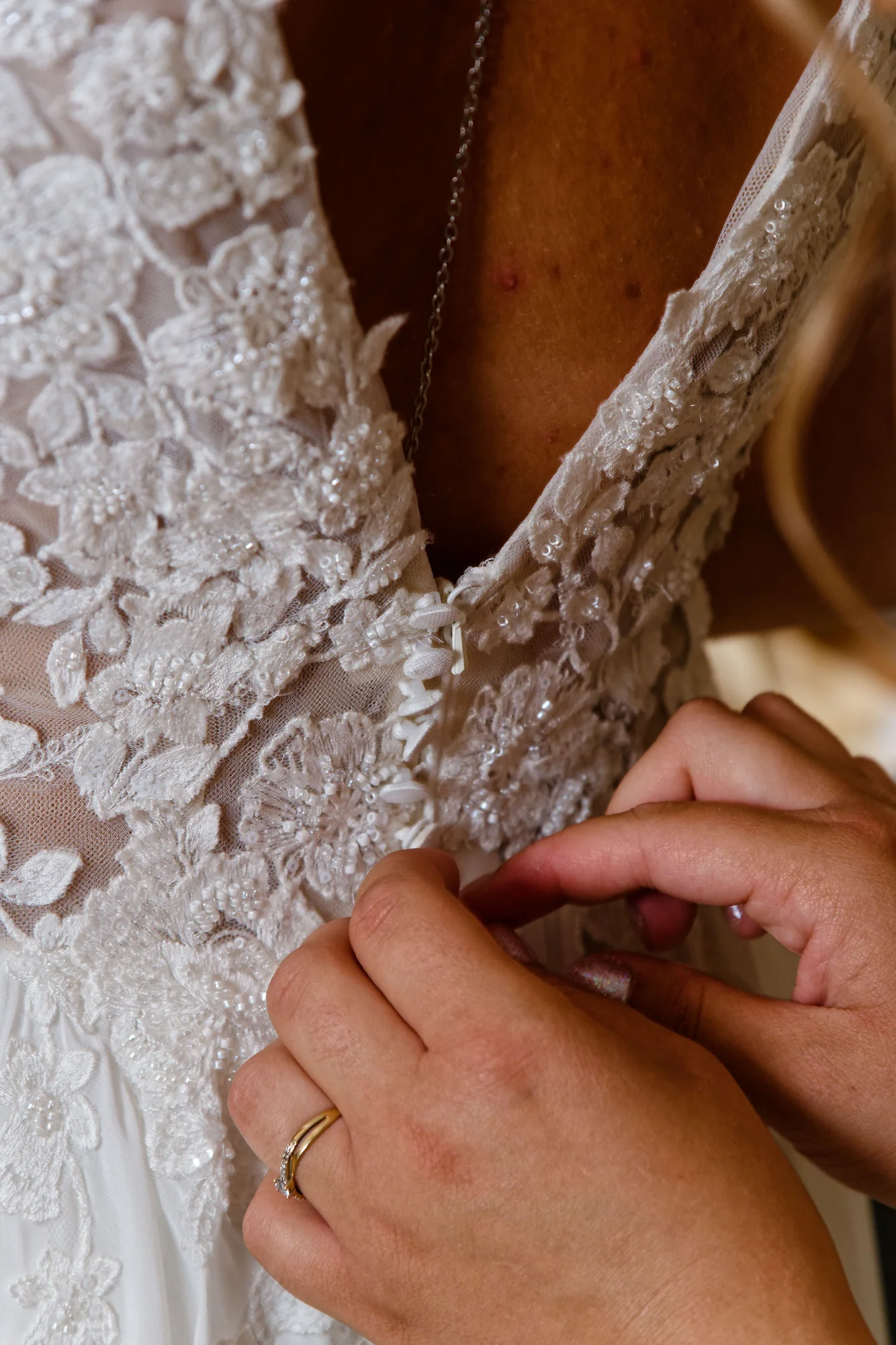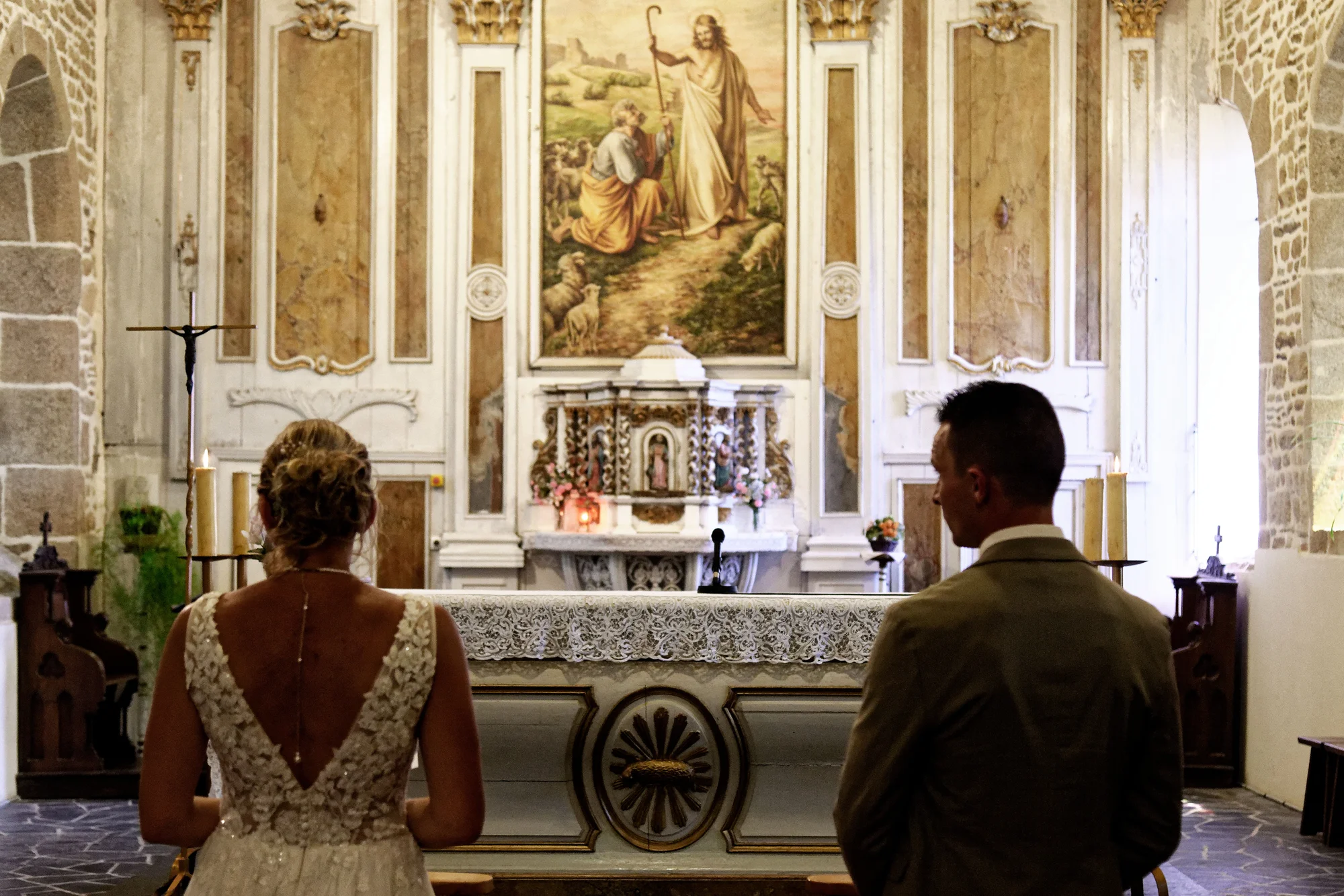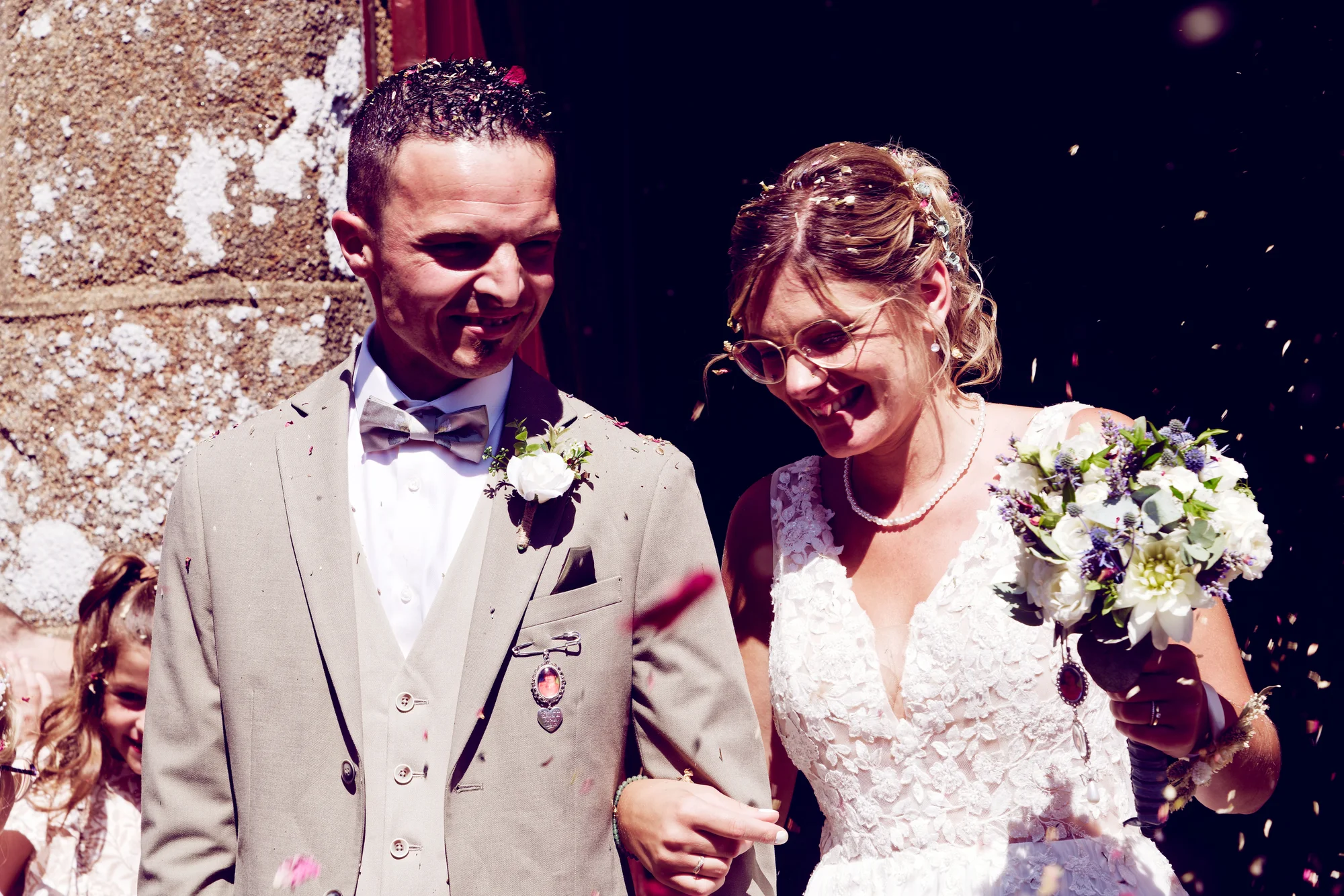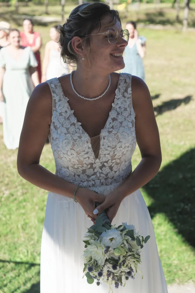 Dès les premiers instants, le sourire de Mélanie illumine l'assemblée. Vêtue d'une robe délicate au bustier de dentelle florale, elle incarne une mariée moderne et radieuse. Le style champêtre se dessine dans les détails : un bouquet aux nuances végétales, des regards complices et cette lumière d'été qui vient caresser les visages. L'authenticité est le maître-mot, loin des artifices, pour ne laisser place qu'à l'essentiel : l'émotion pure.