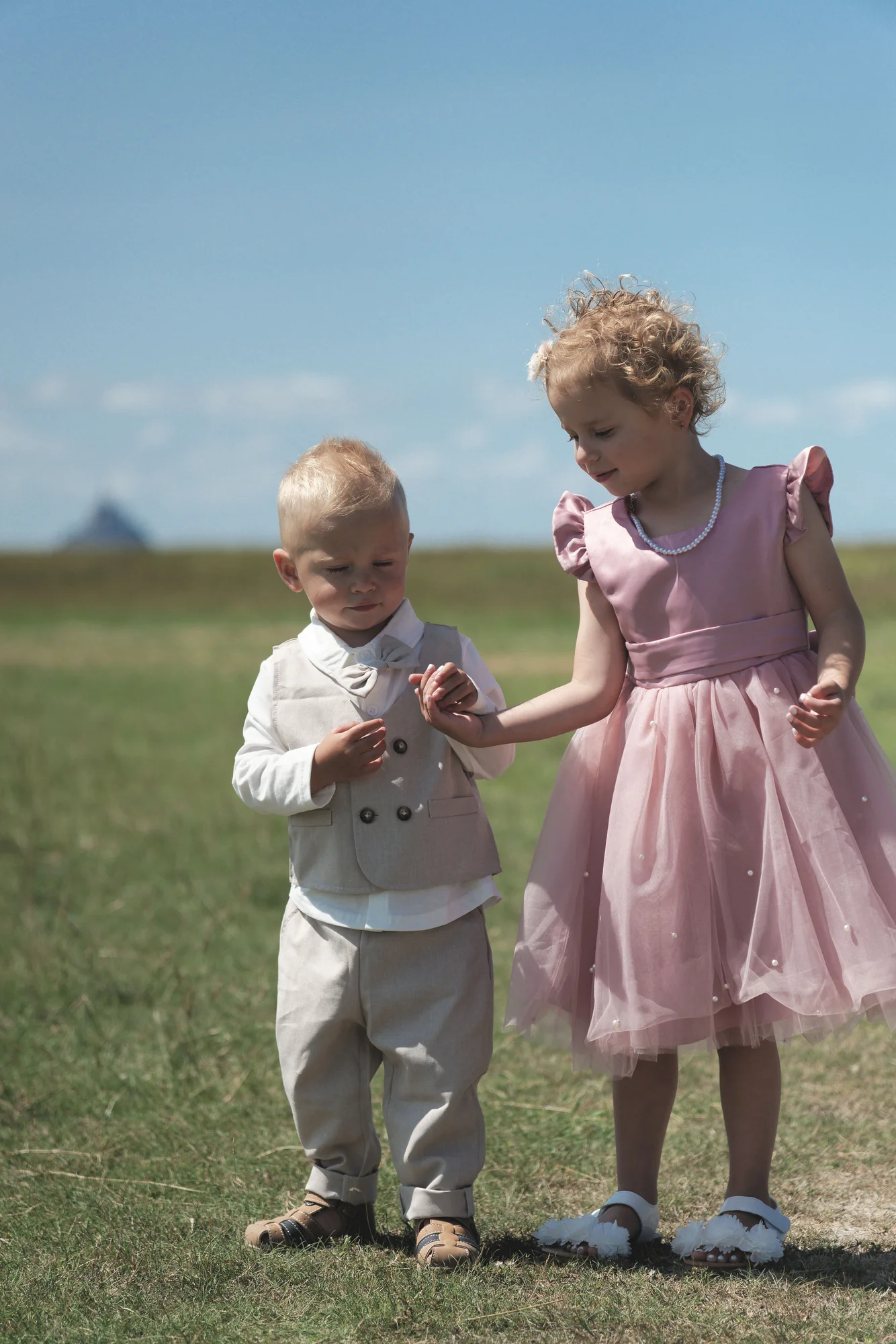 Loin de l’effervescence, le couple s’est autorisé une échappée suspendue dans le temps. Le Gué de l’Épine a offert un décor naturel d’une rare élégance, avec la silhouette iconique du Mont-Saint-Michel veillant au loin. Ce moment de calme, entre tendresse et complicité, a permis de capturer l’essence même de leur amour : une force tranquille face à l’immensité, sublimée par les rayons d’un soleil couchant qui embrasait l’horizon.
