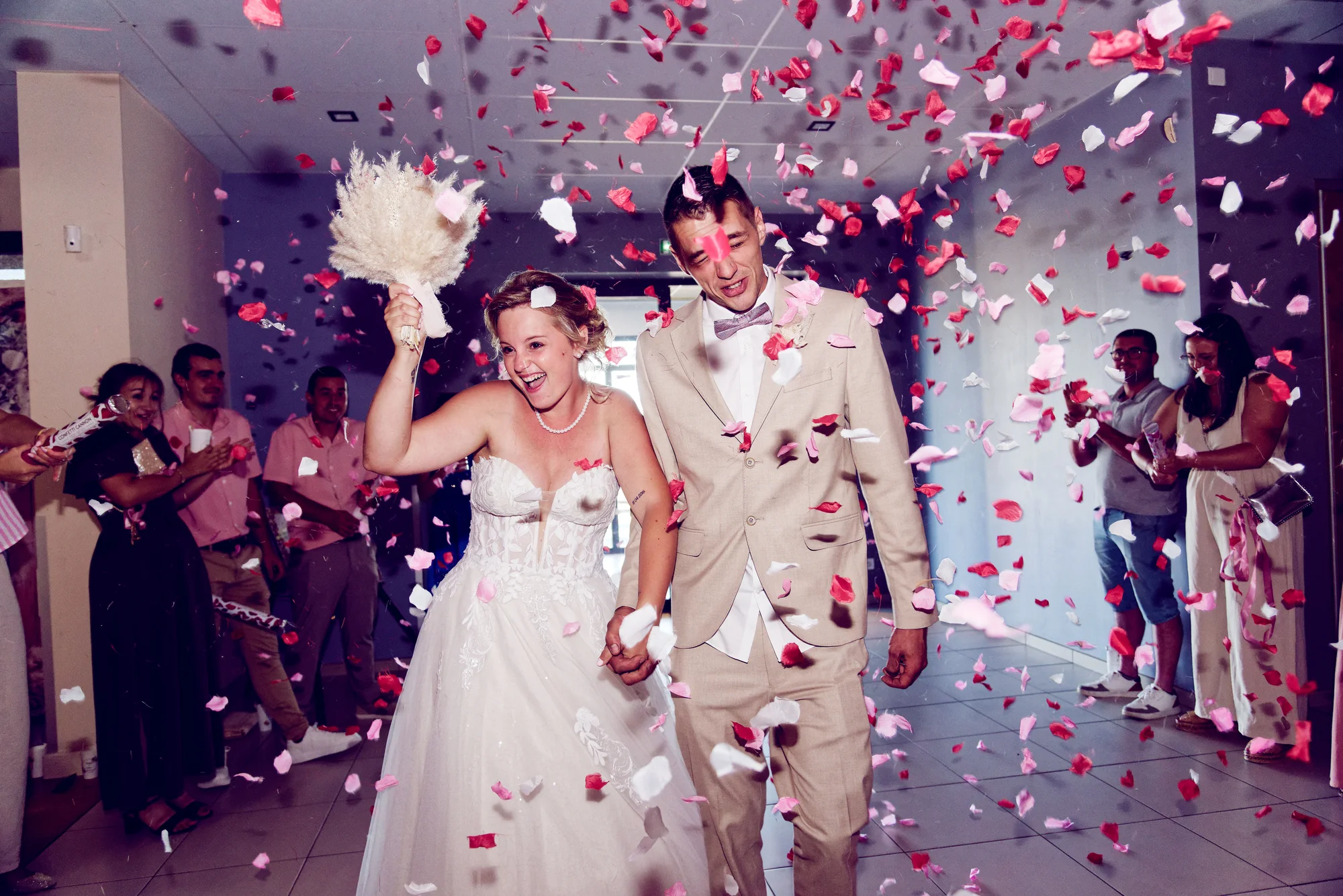 La journée a débuté sous les meilleurs auspices, avec une cérémonie empreinte d’émotion. À la sortie, l’air s’est chargé de couleurs alors qu’une pluie de pétales de roses célébrait les nouveaux mariés. Les sourires d’Oceane et Mickaël, rayonnants de bonheur, marquaient le début d’un nouveau chapitre, entourés de la chaleur de leurs proches dans une atmosphère de pure allégresse.