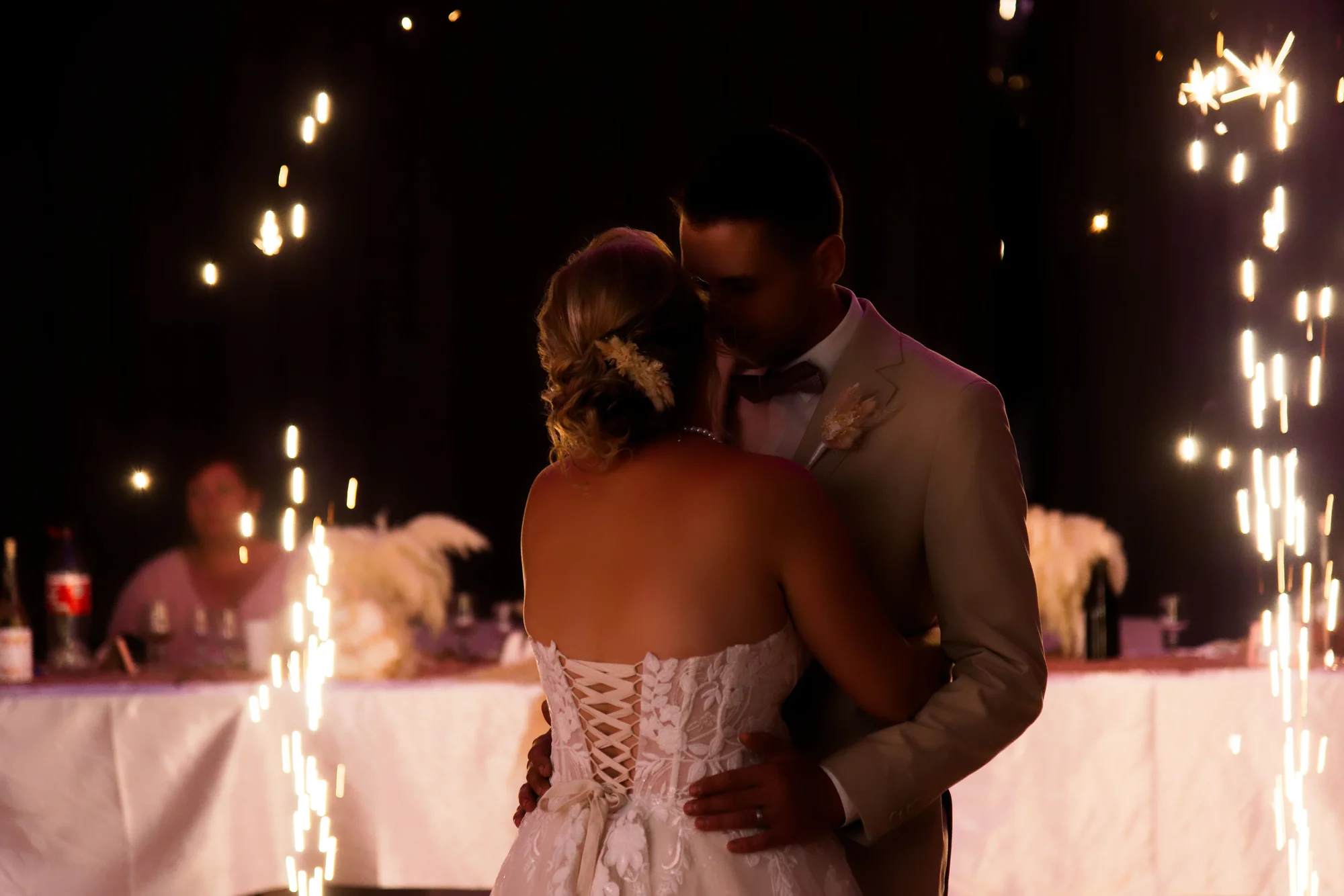La célébration s’est poursuivie dans une salle des fêtes métamorphosée. Le style classique a trouvé son expression dans une décoration soignée aux tons poudrés et terracota, où les herbes de la pampa apportaient une touche aérienne et moderne. Chaque détail, du dressage des tables circulaires aux délicates pièces cocktail, témoignait d’une attention particulière portée à l’accueil et au partage.